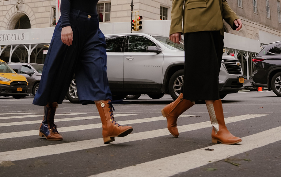 Eighteen designs, each one shaped to move with the pace of its wearer. The colors and textures were drawn from the city itself. The molten gold of sunlight caught on glass at dusk. The pearl hush of dawn before the first horn sounds. The deep blue that settles over the skyline before the night sharpens. The warm rust tones of façades still holding the day’s last light. Each shoe began as a memory of light or sound or motion before it became form.